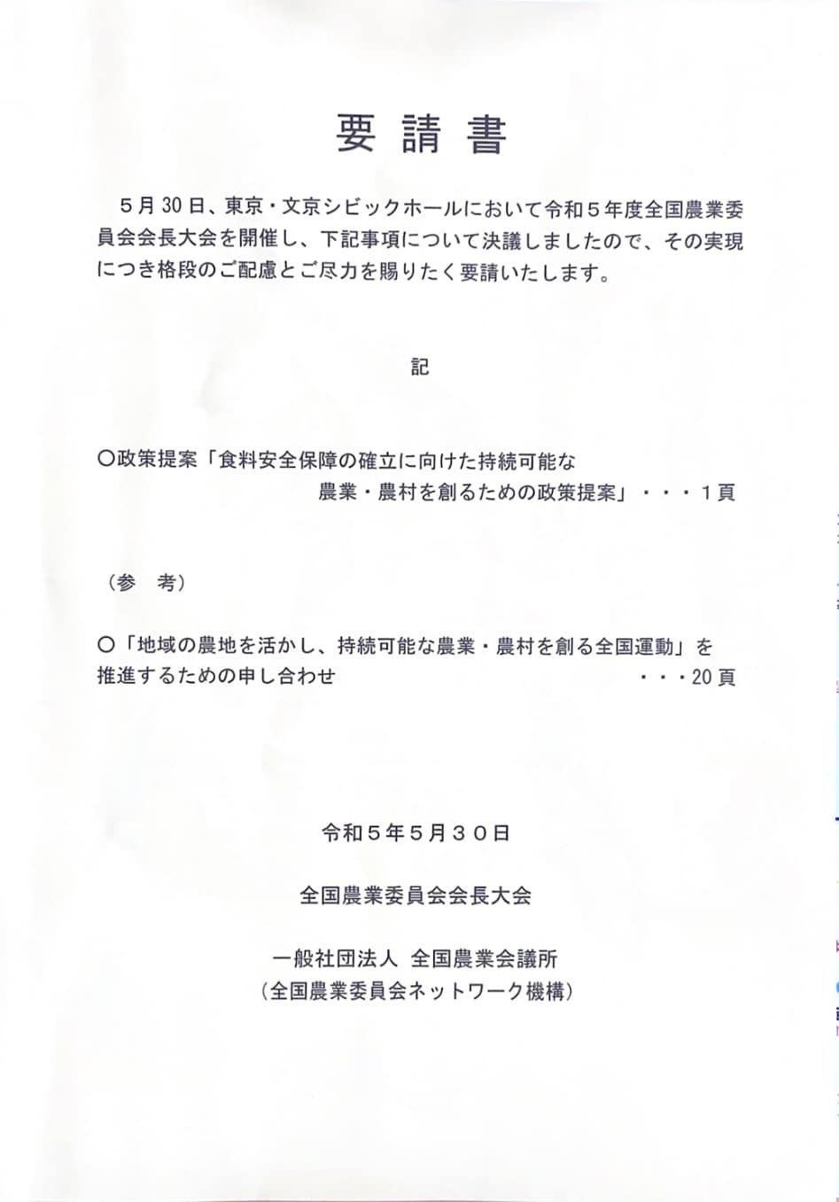 全国農業委員会会長会議が開催され、愛知県農業会議川上万一郎会長より要請書をちょうだいしました。