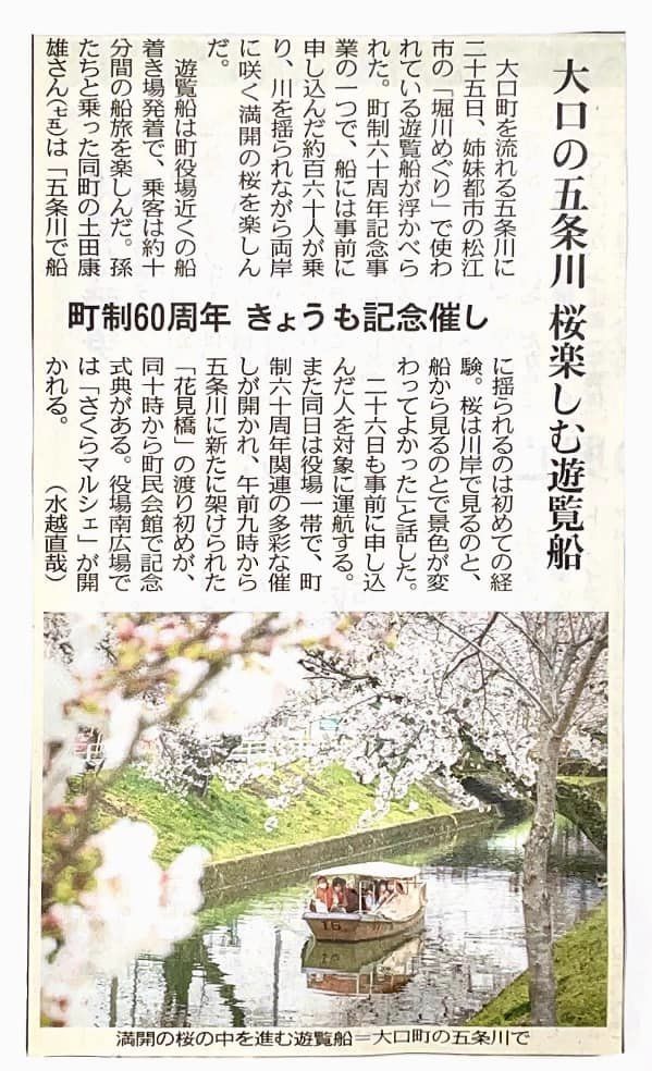 私の在所でもありますが、大口町の五条川の桜並木は日本桜100選にも選ばれ、この度松江堀川遊覧船一隻が寄贈されました。