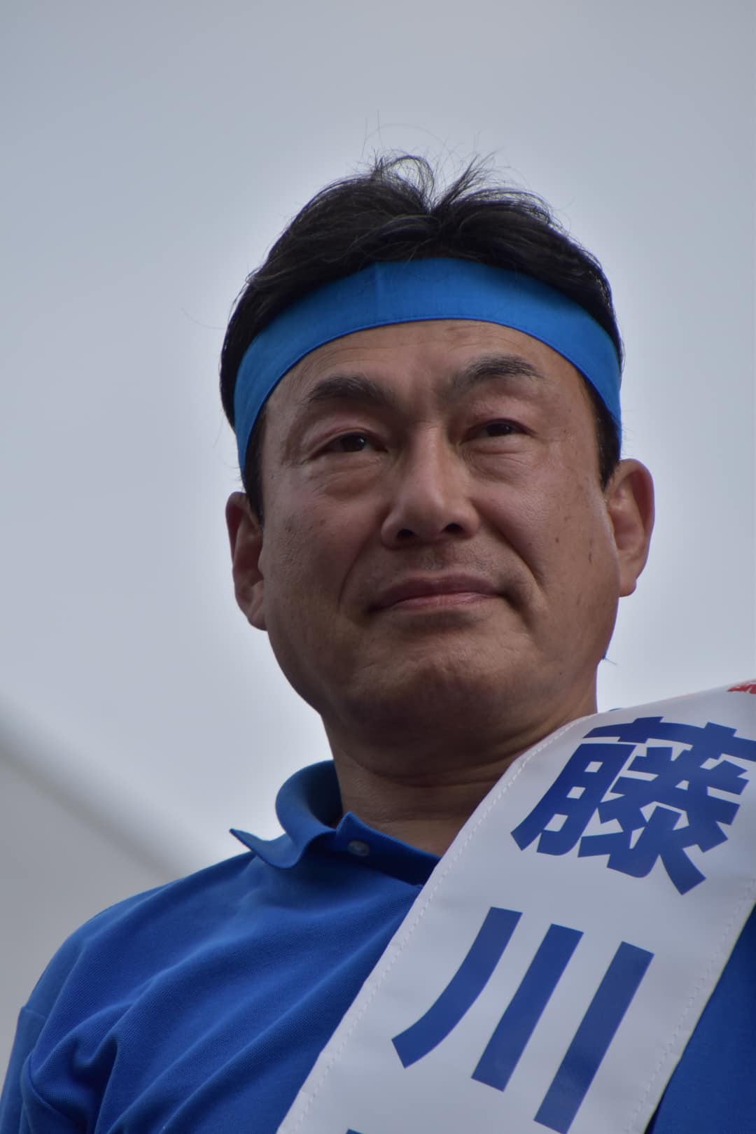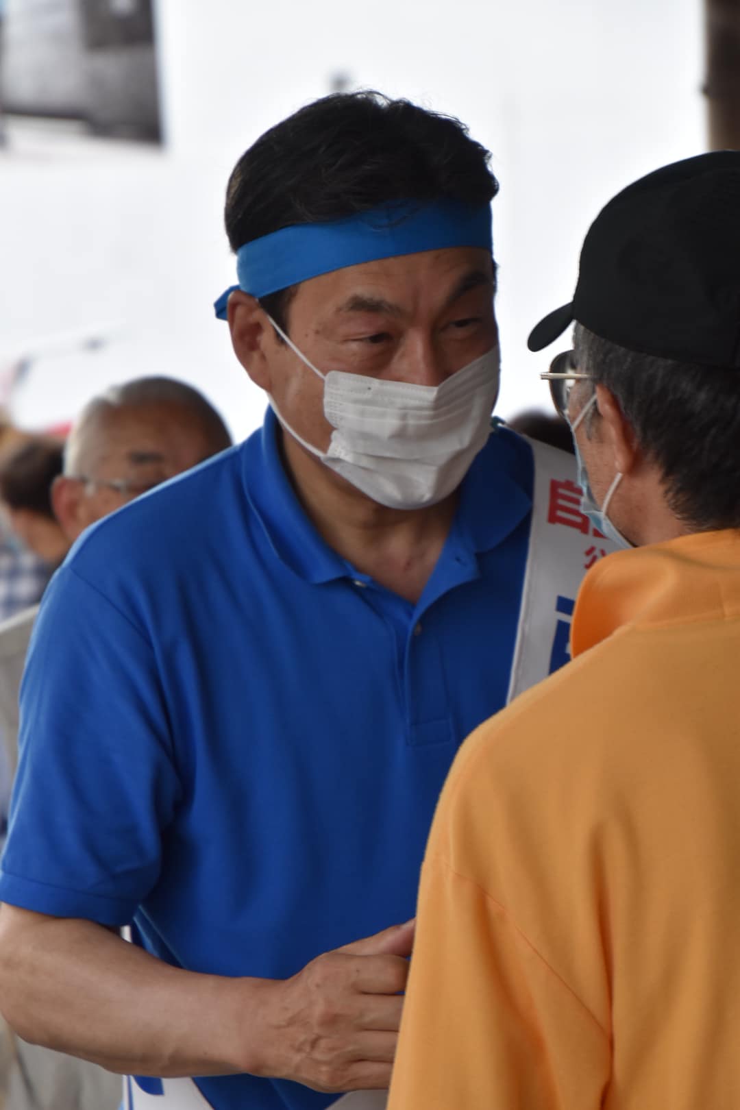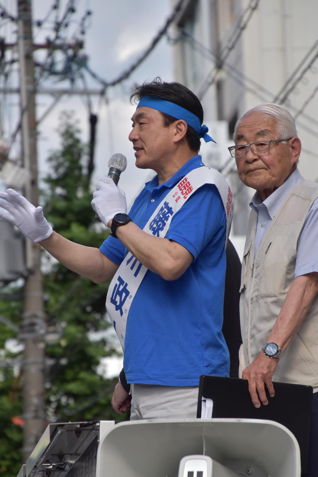 暑い中の街頭演説には鉢巻きが必須となってきました。(汗が滴り落ちません)