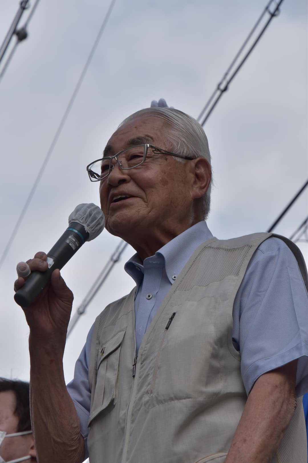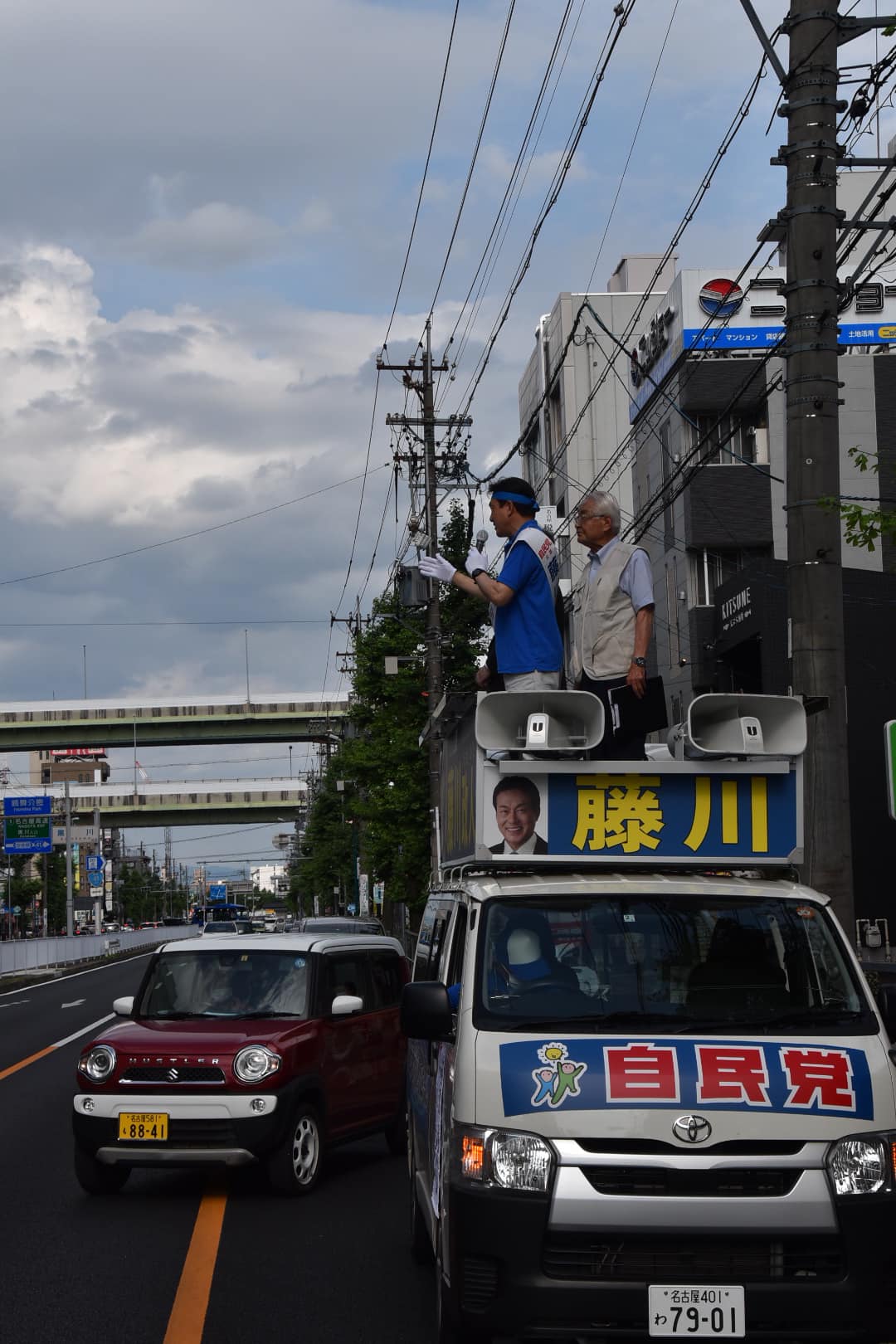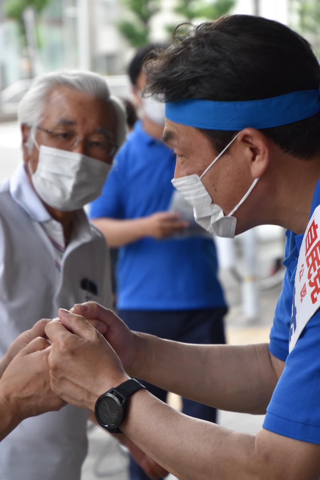 暑い中の街頭演説には鉢巻きが必須となってきました。(汗が滴り落ちません)