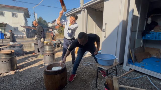 柏森南町内会の餅つき大会にてひと臼つ…